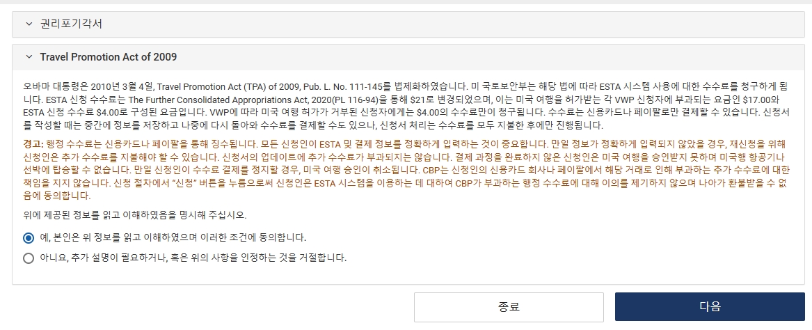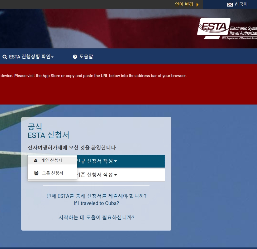 신청은 인터넷창을 하나 더 띄워서 ESTA 신청하는 사이트로 접속합니다.