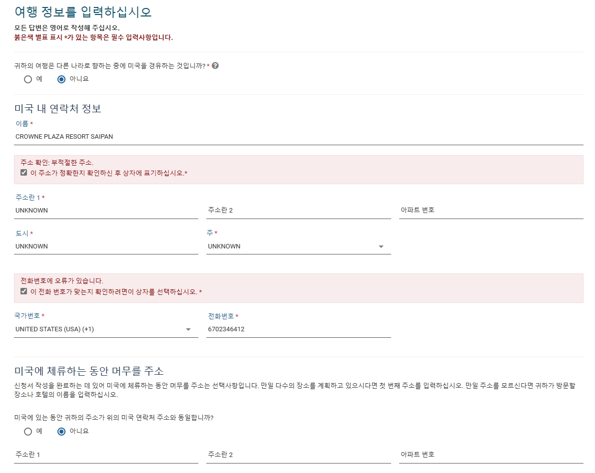 저는 미국 내 연락처 정보 이름은 제가 이용하게 될 호텔이름을 적었으며, 나머지 주소관련 내용은 "UNKNOWN" 으로만 기입했습니다.