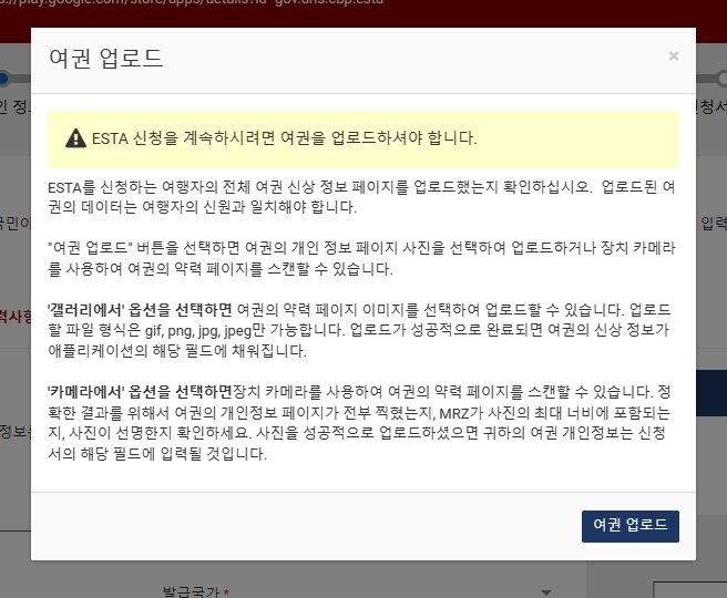 다음으로 넘어가면 여권을 업로드를 하는 창이 뜨는데요, 저는 창을 끄고 직접 작성하려 했지만 일단 여권 사진은 무조건 업로드 하게 되어있습니다.