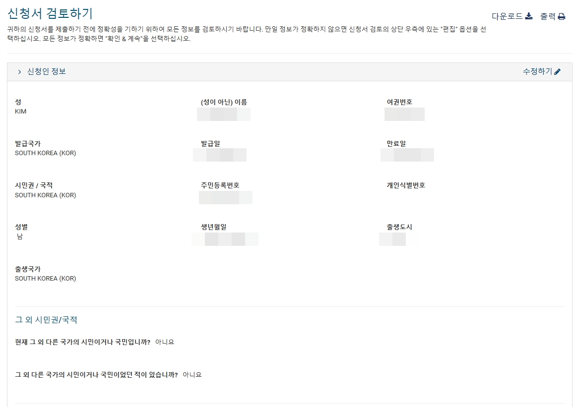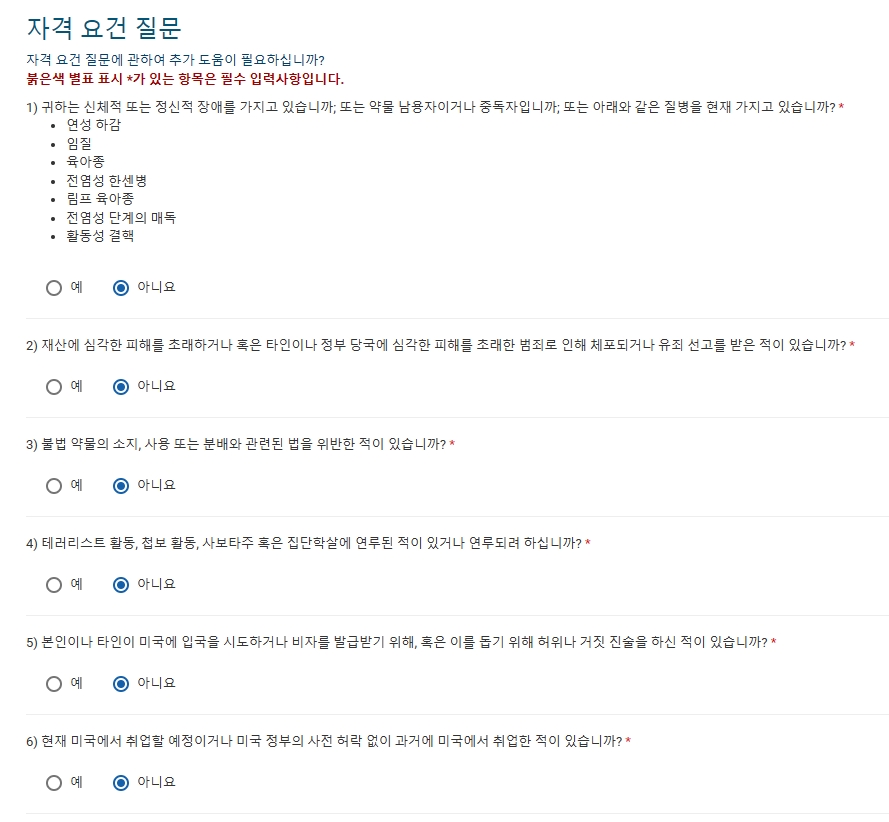 자격 요건과 관련된 질문에 대해서는 전부 "아니요" 를 선택해서 진행해 주면 되며, 최종적으로 비자신청서를 제출하기 전에 다시한번 내용을 검토하도록 되어있습니다. 틀린부분이 없는지 마지막으로 확인하고 진행하면 됩니다.