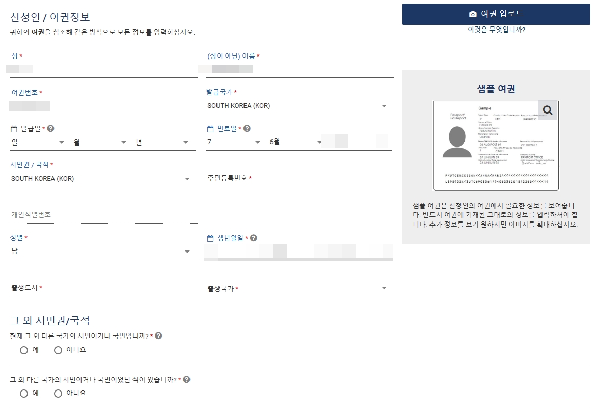 그래서 촬영해둔 여권사진을(샘플 여권 참고) 업로드를 해주면 기본적인 정보는 자동으로 기입되게 됩니다.