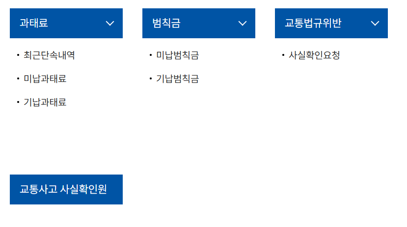 - 교통법규 위반 조회: 과속, 신호위반 등 교통법규 위반 내역을 확인할 수 있습니다.