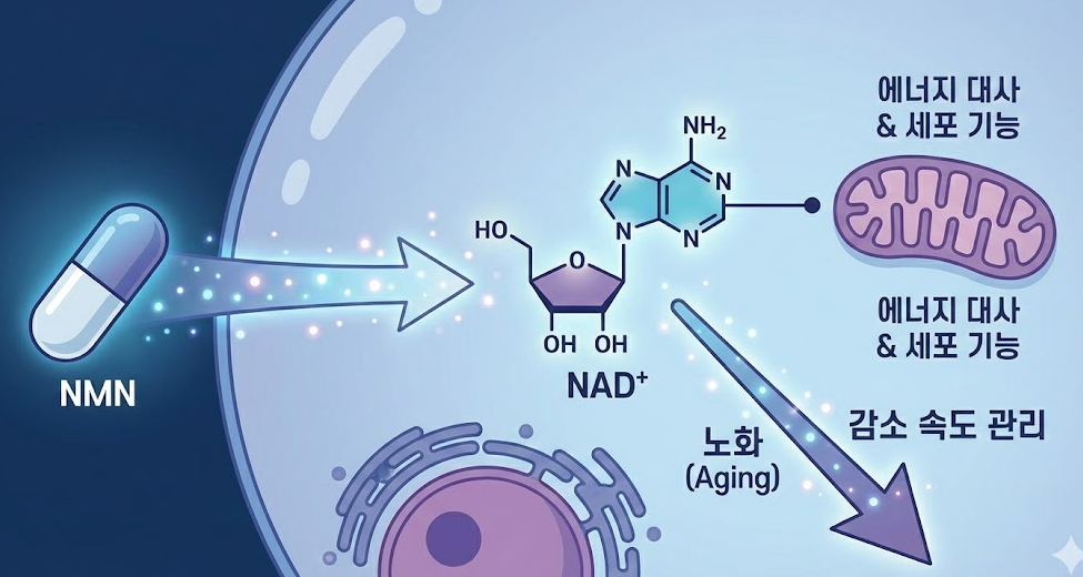 NAD⁺는 에너지 대사와 세포 기능 유지에 관여하는 물질로, 나이가 들수록 자연스럽게 감소합니다. NMN 섭취는 이 감소 흐름을 완만하게 만드는 데 초점을 둡니다.