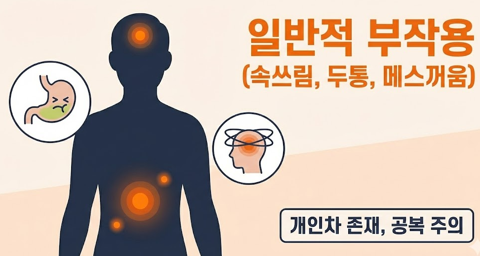 특히 공복 섭취 시 이런 반응이 나타날 가능성이 있습니다. 이런 경우 섭취 시점이나 용량 조절이 필요합니다.