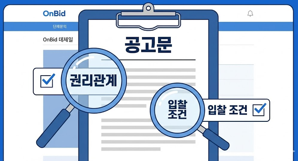 공고문은 물건의 모든 조건이 담긴 문서입니다. 단순 가격 정보만 보는 것이 아니라 권리관계, 점유 상태, 책임 범위, 입찰 방식까지 반드시 확인해야 합니다. 정보 누락이 가장 큰 리스크입니다.