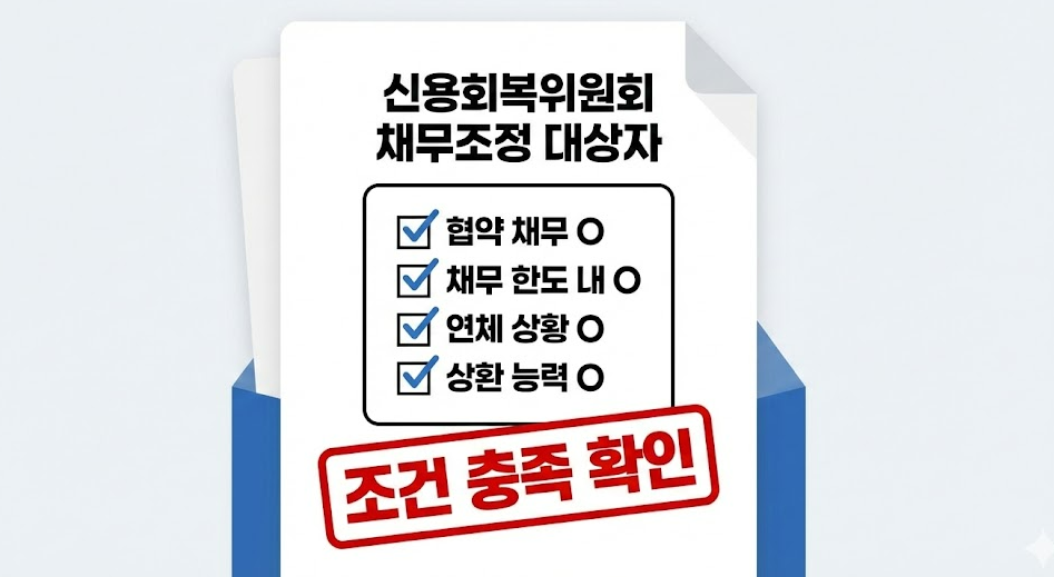신용회복위원회 채무조정 대상자는 단순 채무 보유자나 연체 경험자 전체가 아니라, 협약 금융회사 채무를 가진 개인 중 상환 여력이 떨어지고 연체 또는 연체 우려가 있는 경우에 한해 신청이 가능합니다.