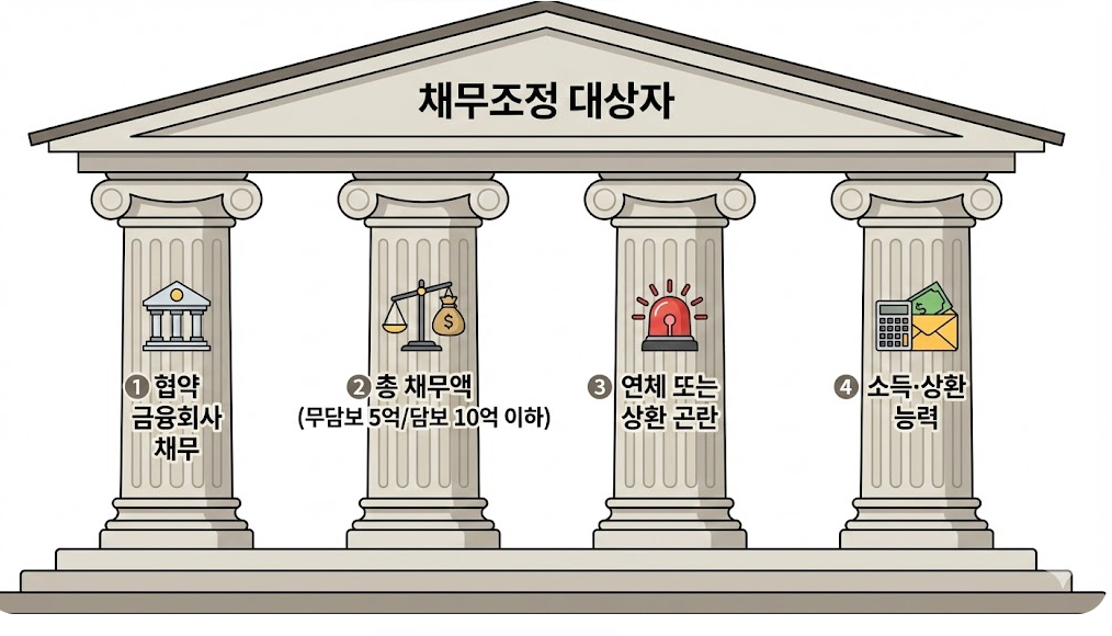 총 채무액 한도, 연체 기간, 소득과 상환 능력 등이 모두 고려되어 대상자 여부가 결정됩니다.