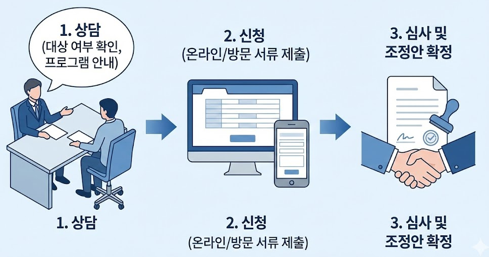 신청은 온라인 또는 방문 상담을 통해 할 수 있으며, 상담 결과에 따라 조정 계획을 수립합니다.