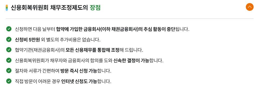 - 즉시 추심 중단, 일부 이자율 조정 등의 혜택이 주어집니다.