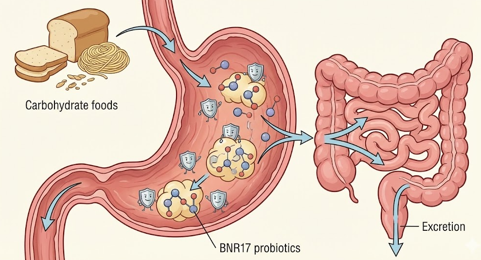 1. 탄수화물 흡수 억제 및 배출 BNR17의 가장 독특한 특징은 체내에서 탄수화물을 단당류로 분해하여 흡수되는 것을 막고, 이를 다당류 형태로 합성하여 몸 밖으로 배출시킨다는 점입니다. 쉽게 말해, 먹은 탄수화물이 살로 가는 것을 일부 막아주는 역할을 합니다.