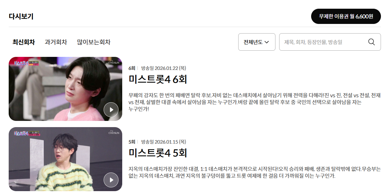 대한민국을 다시 한번 트로트 열풍으로 몰아넣은 '미스트롯4'의 인기가 뜨겁습니다. 매주 화려한 무대와 감동적인 서사가 이어지다 보니, 본방송 시간을 놓친 시청자들의 재방송 문의가 쏟아지고 있는데요. 본방 사수에 실패했다고 해서 아쉬워할 필요는 없습니다.