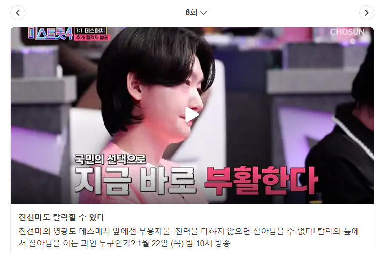 - 공식 홈페이지 클립: 전체 풀버전이 부담스럽다면 TV조선 홈페이지의 '다시보기' 메뉴에서 주요 참가자의 무대 영상만 골라 시청할 수 있습니다.