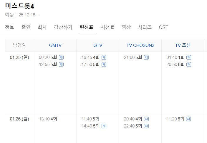 - 확인 루틴: 포털에서 '미스트롯4 편성표' 검색 → 채널별 시간 비교.