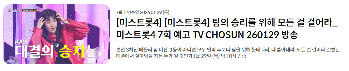 - 채널별 검색: TV조선2나 3, 혹은 기타 케이블 채널은 각 채널의 홈페이지에서 '미스트롯4' 혹은 '미스트롯4 베스트'로 검색하면 숨은 방송 시간을 찾을 수 있습니다.