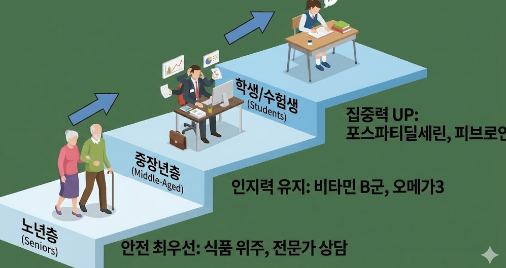 | 중장년층 | 비타민 B군, 오메가3, 비타민 D | 인지 기능 유지 |