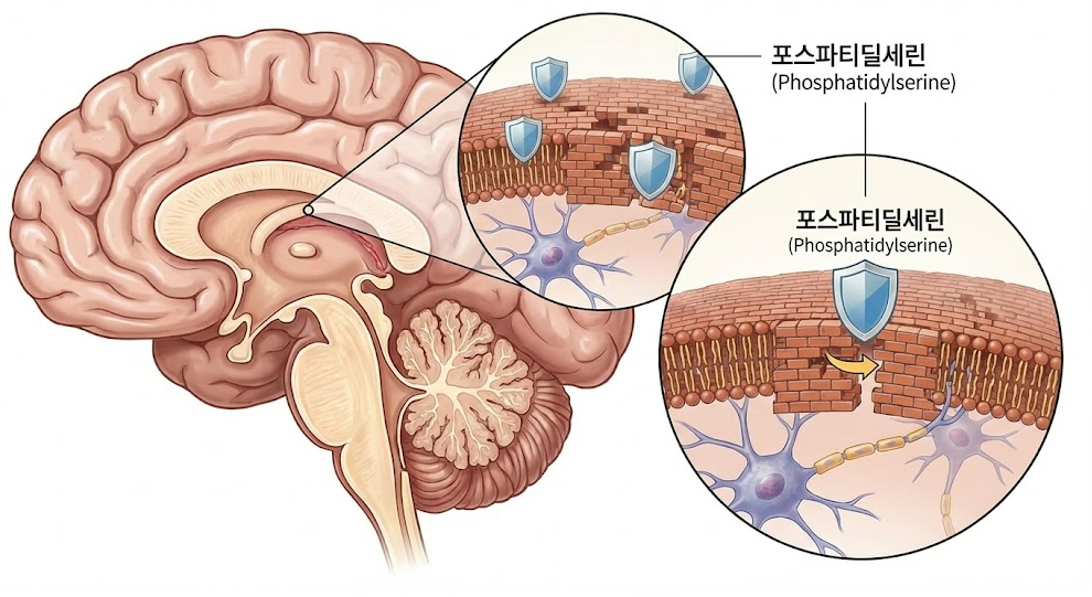포스파티딜세린은 뇌세포를 손상시키는 물질을 감소시켜 뇌세포막을 건강하게 만들고, 정보를 주고받을 때 필요한 물질을 합성하는 데 관여합니다. 식약처에서 인지력 개선에 도움을 줄 수 있다고 인증받은 성분이죠. 하지만 미국 FDA는 과학적 근거가 제한적이라고 보고 있어요.