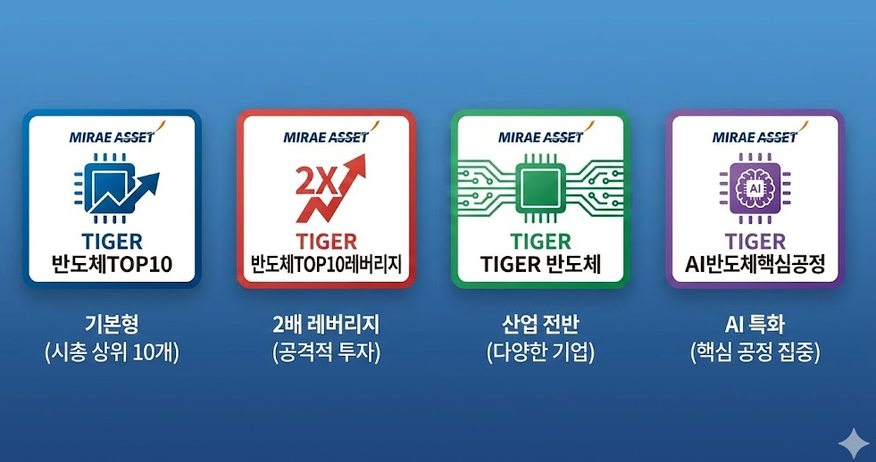 미래에셋자산운용은 TIGER 반도체TOP10 외에도 TIGER 반도체TOP10레버리지, TIGER 반도체, TIGER AI반도체핵심공정 등 4종의 국내 반도체 ETF 라인업을 보유하고 있습니다. 투자 성향에 맞는 상품을 선택할 수 있어요.