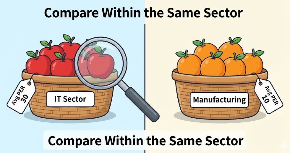 비교하고자 하는 기업들이 서로 같은 업종이어야 의미가 있습니다. 업종마다 특성이 다르니 적정한 PER도 다를 수밖에 없으므로, 서로 다른 업종의 기업끼리 PER를 비교해서 저평가·고평가 판단을 하는 것은 의미가 없어요.