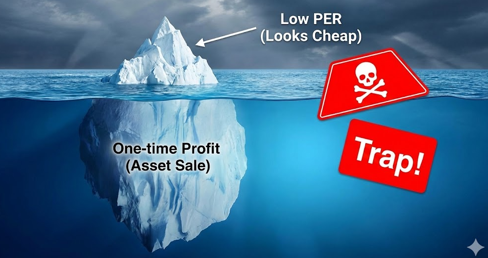 부동산을 팔거나 자산을 처분해서 일시적으로 큰 이익이 발생하면 PER이 갑자기 낮아질 수 있어요. 하지만 이런 이익은 지속되지 않기 때문에, 다음 해에는 다시 PER이 높아질 수 있습니다.