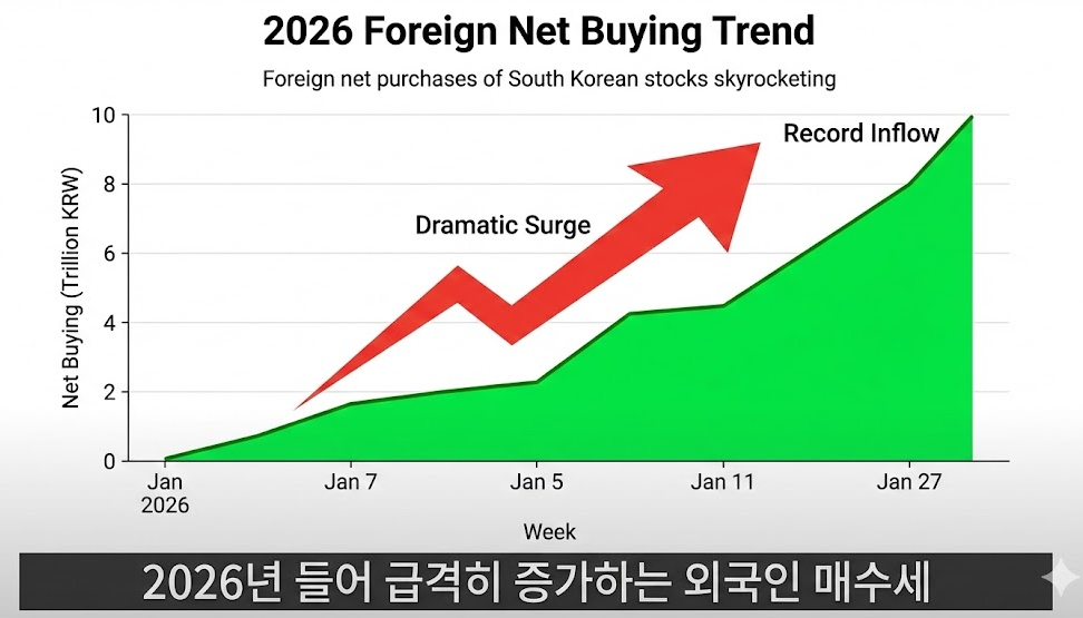 2026년 초부터 외국인 투자자들은 한국 시장을 무차별적으로 매수하고 있습니다. 특히 단순한 단타성 자금이 아니라, 글로벌 AI 인프라 확장에 베팅하는 장기 성격의 자금이 유입되고 있다는 점에 주목해야 합니다. 이는 코스피 지수 5,000 포인트 돌파 시도가 허황된 꿈이 아니라는 증거이기도 합니다.
