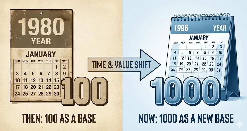 - 코스닥 지수: 1996년 7월 1일의 시가총액을 1,000으로 놓고 비교합니다. 원래는 100이었지만, 코스피와 숫자가 너무 차이 나서 2004년에 10배를 곱해 1,000으로 기준을 바꿨습니다.